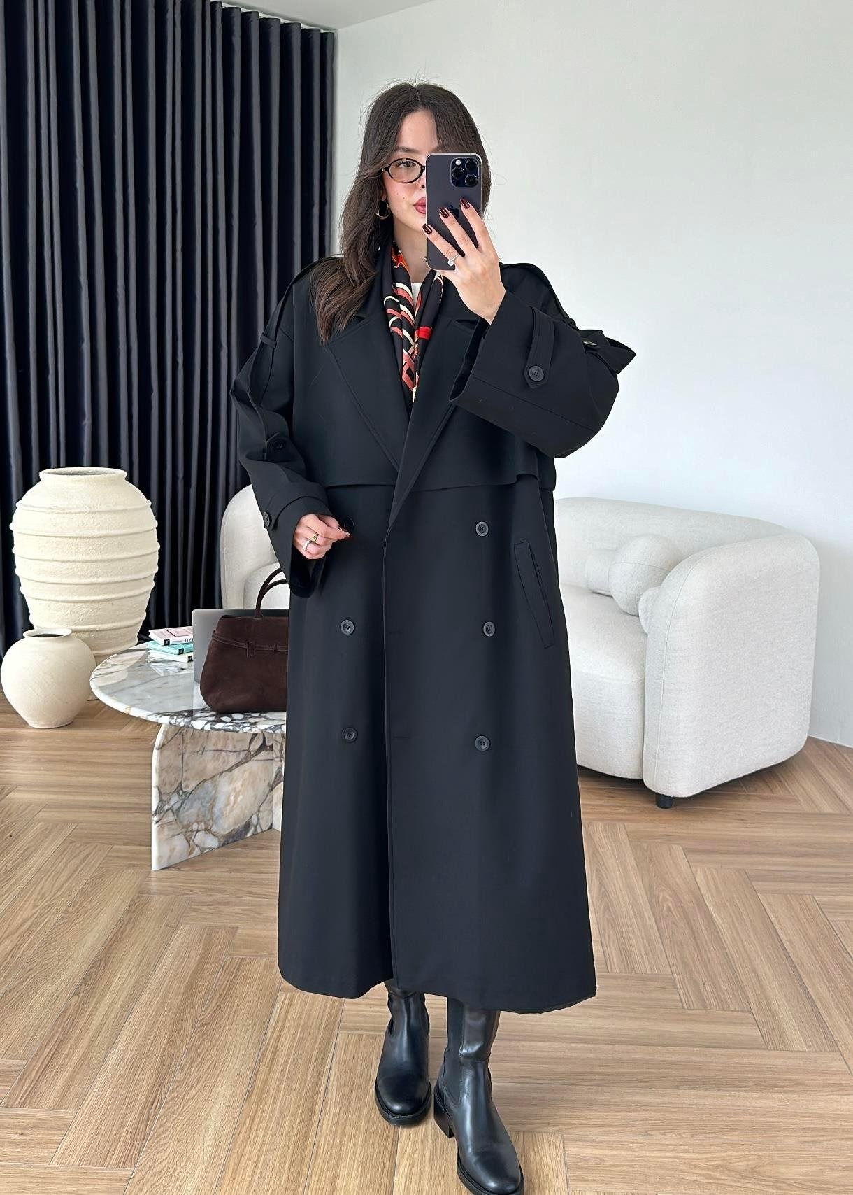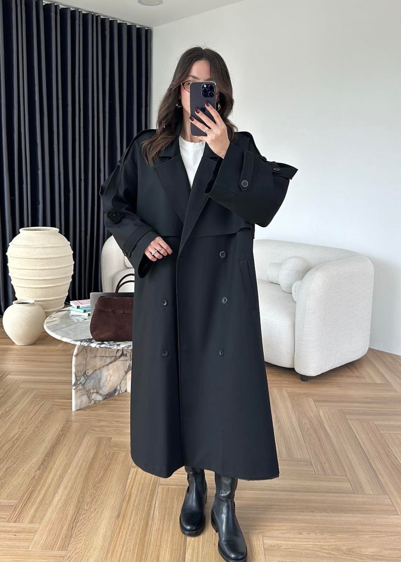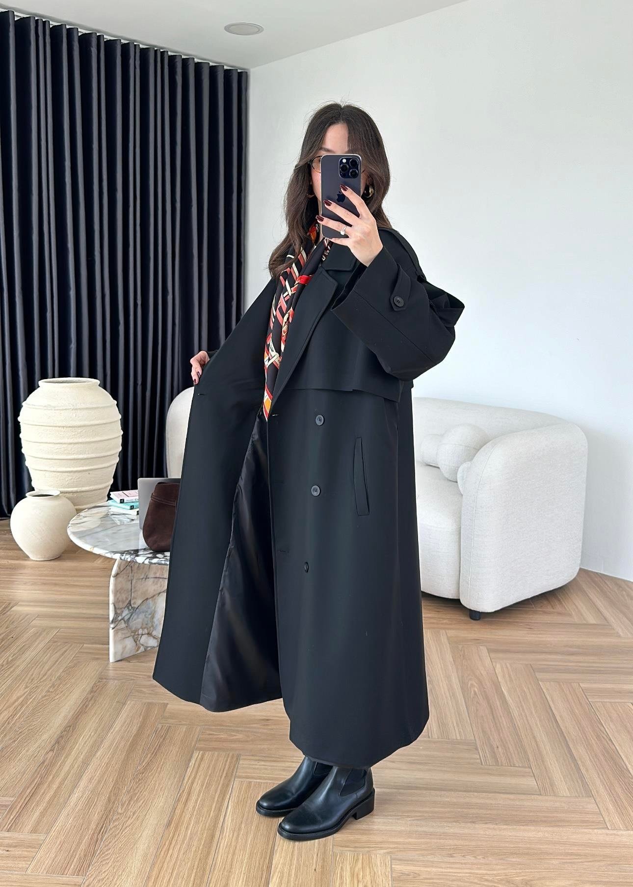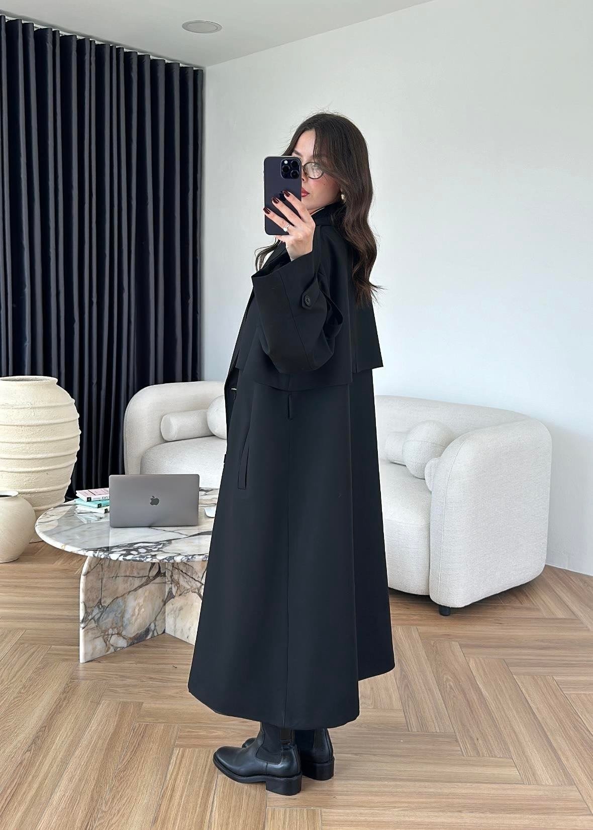 Omuzu Uzun Apoletli Trençkot SİYAH