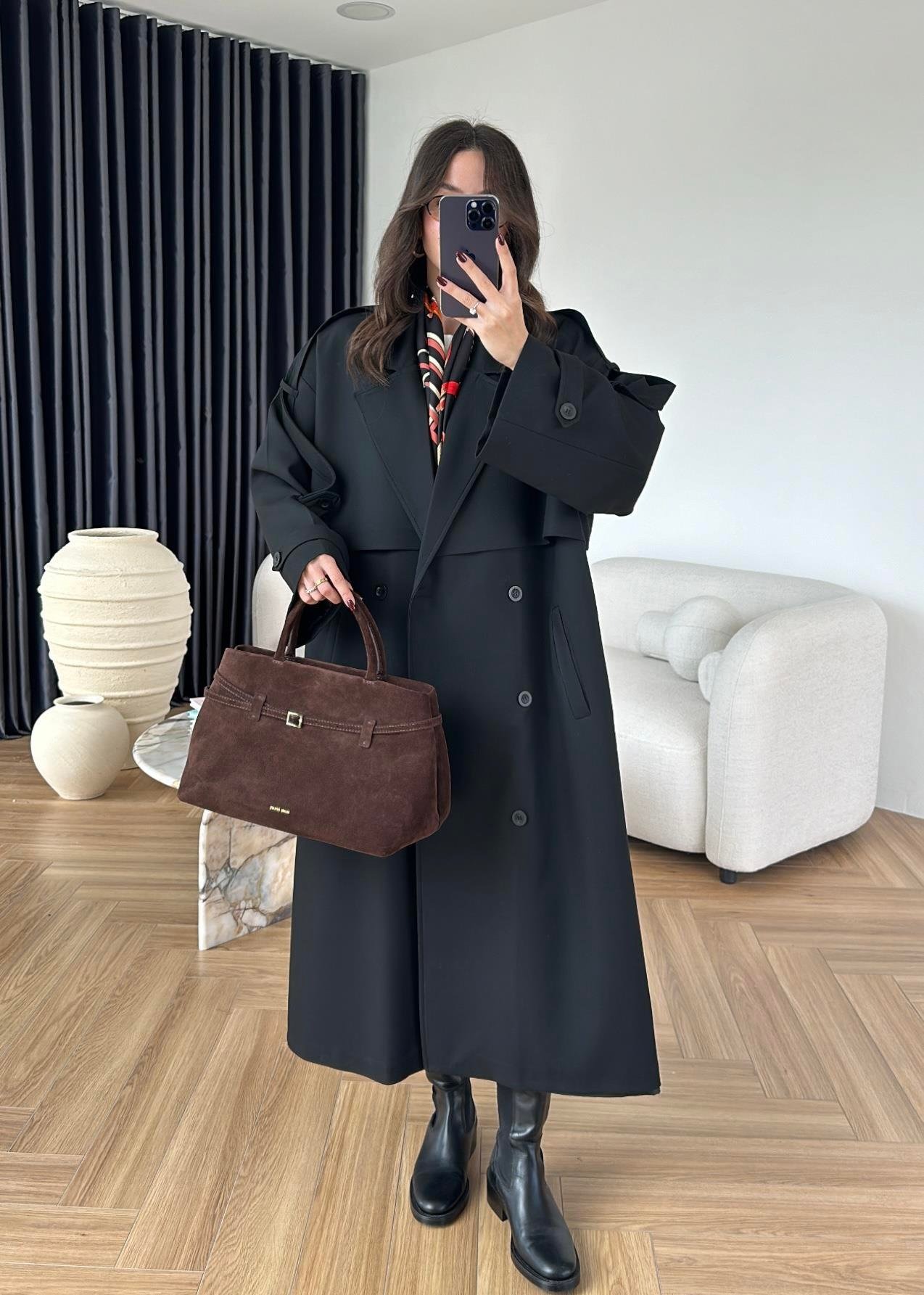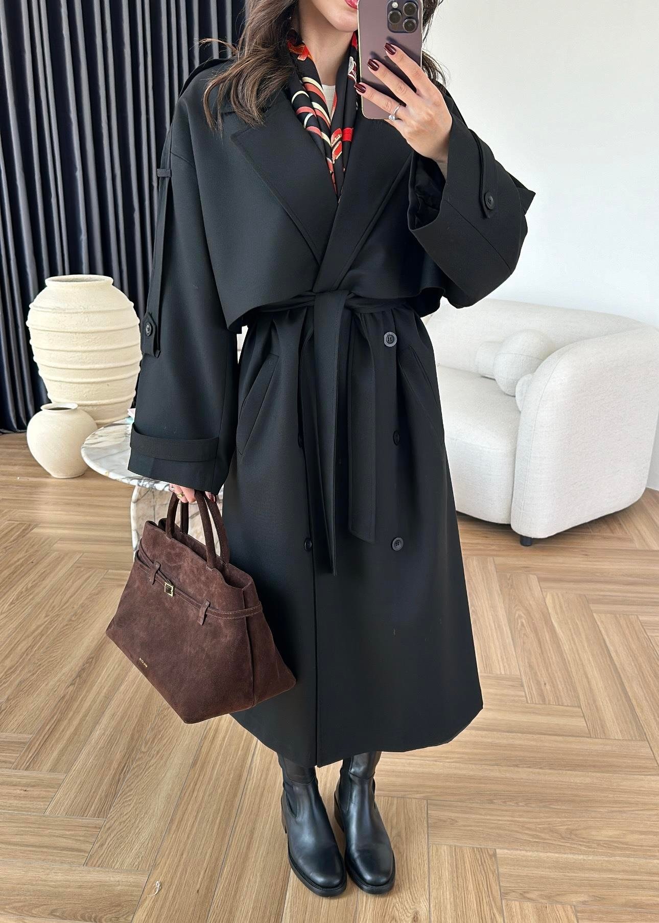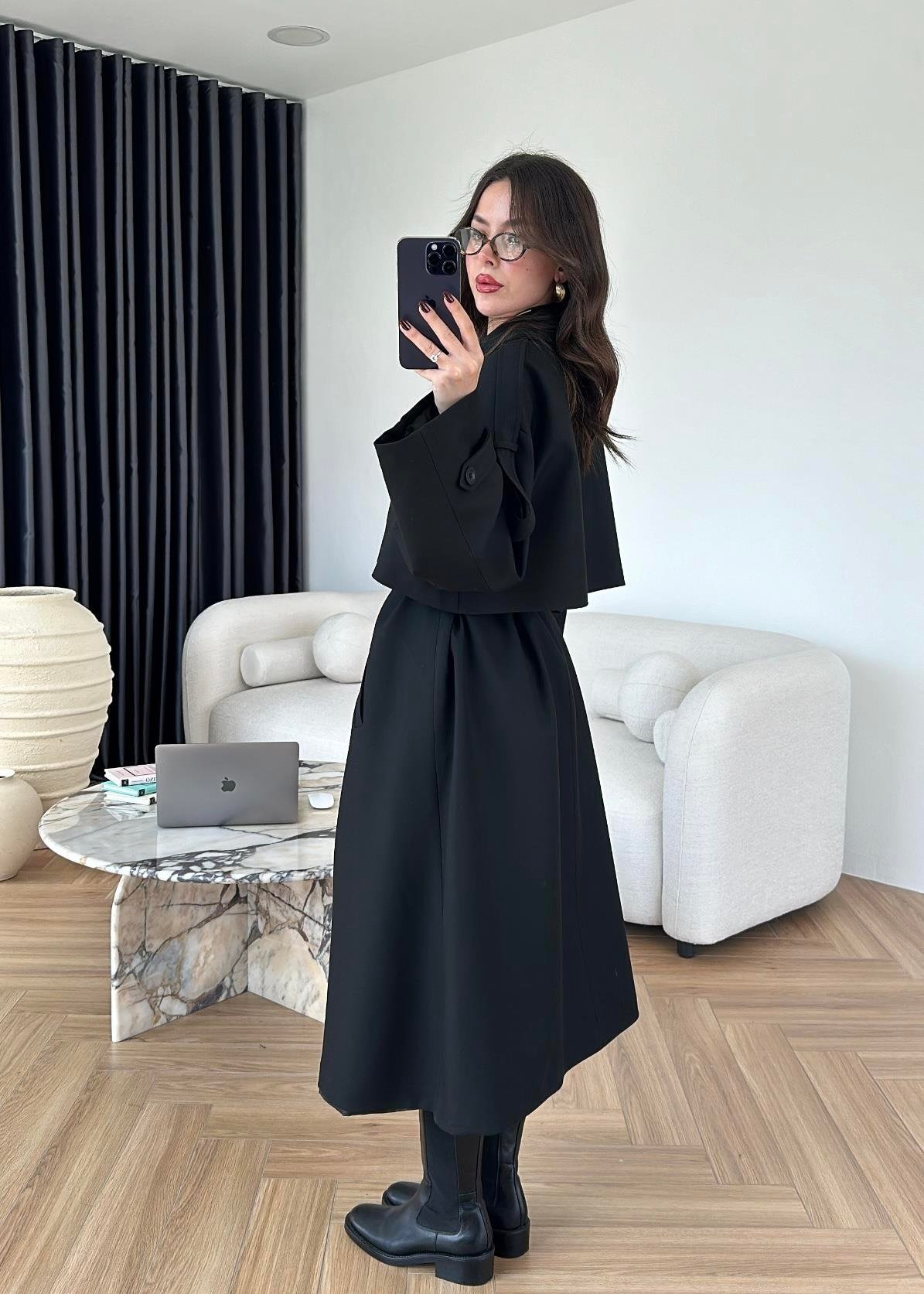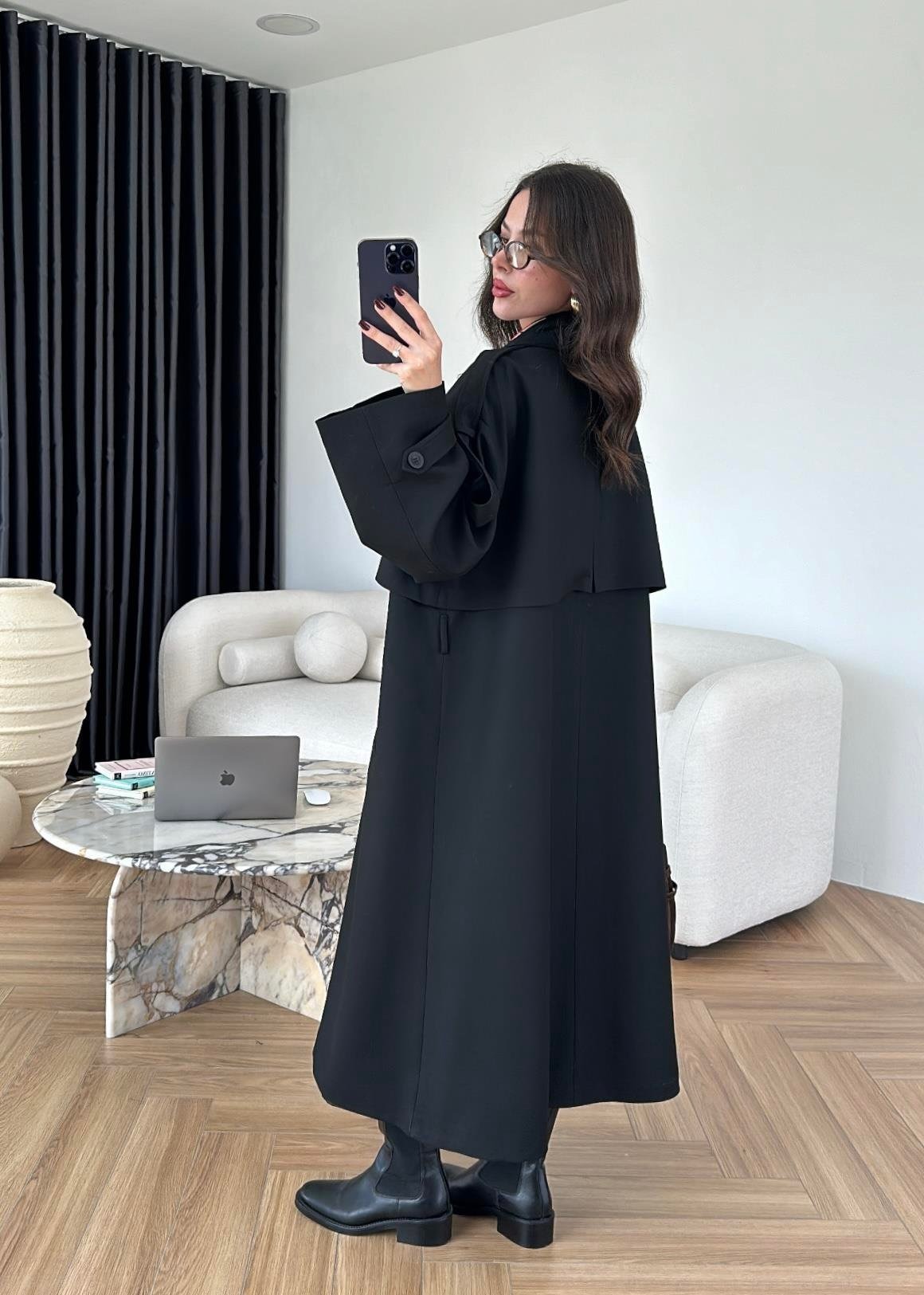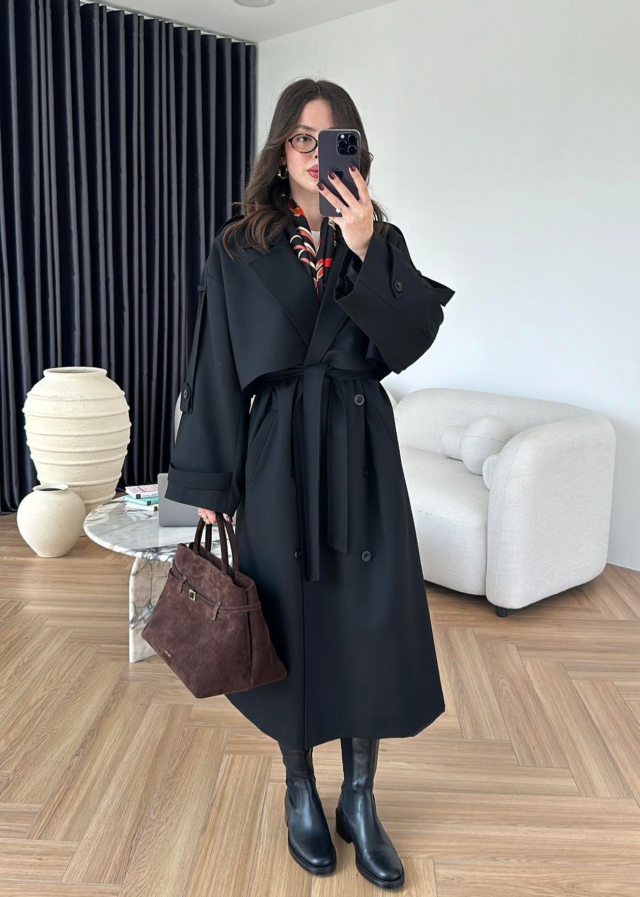 Omuzu Uzun Apoletli Trençkot SİYAH